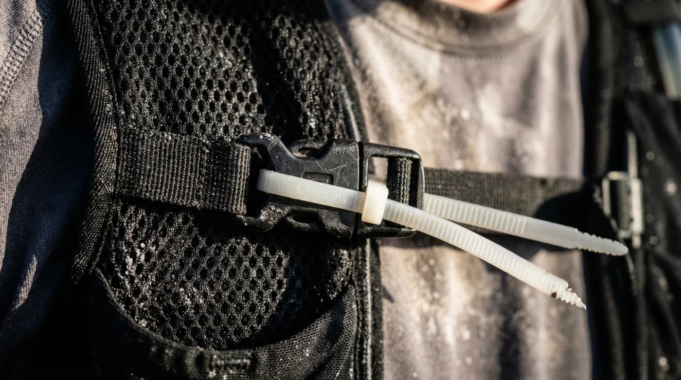 De methode om de Salomon drinkrugzak schuurvrij te maken is even geniaal als simpel, maar de uitvoering luistert nauw. Het doel is om het onderste klemmetje van de borstriem (waar het elastiek doorheen zigzagt) permanent te blokkeren, zodat het elastiek niet meer ongemerkt kan terugglijden. Haal een kleine kabelbinder (tie-wrap) met een maximale breedte van 2.5 mm. Doe je vest aan, belaad het met exact de uitrusting en volle waterflessen (bijvoorbeeld 2 keer 500 ml) die je tijdens een race zou dragen, en stel de borstriemen perfect af. Rijg vervolgens de tie-wrap direct strak achter het harde plastic klemmetje over het dubbele koord, en trek deze meedogenloos strak aan. Knip het uitstekende uiteinde van de tie-wrap met een scherpe tang af, zodat er geen scherp randje overblijft dat in je vingers of shirts kan snijden.