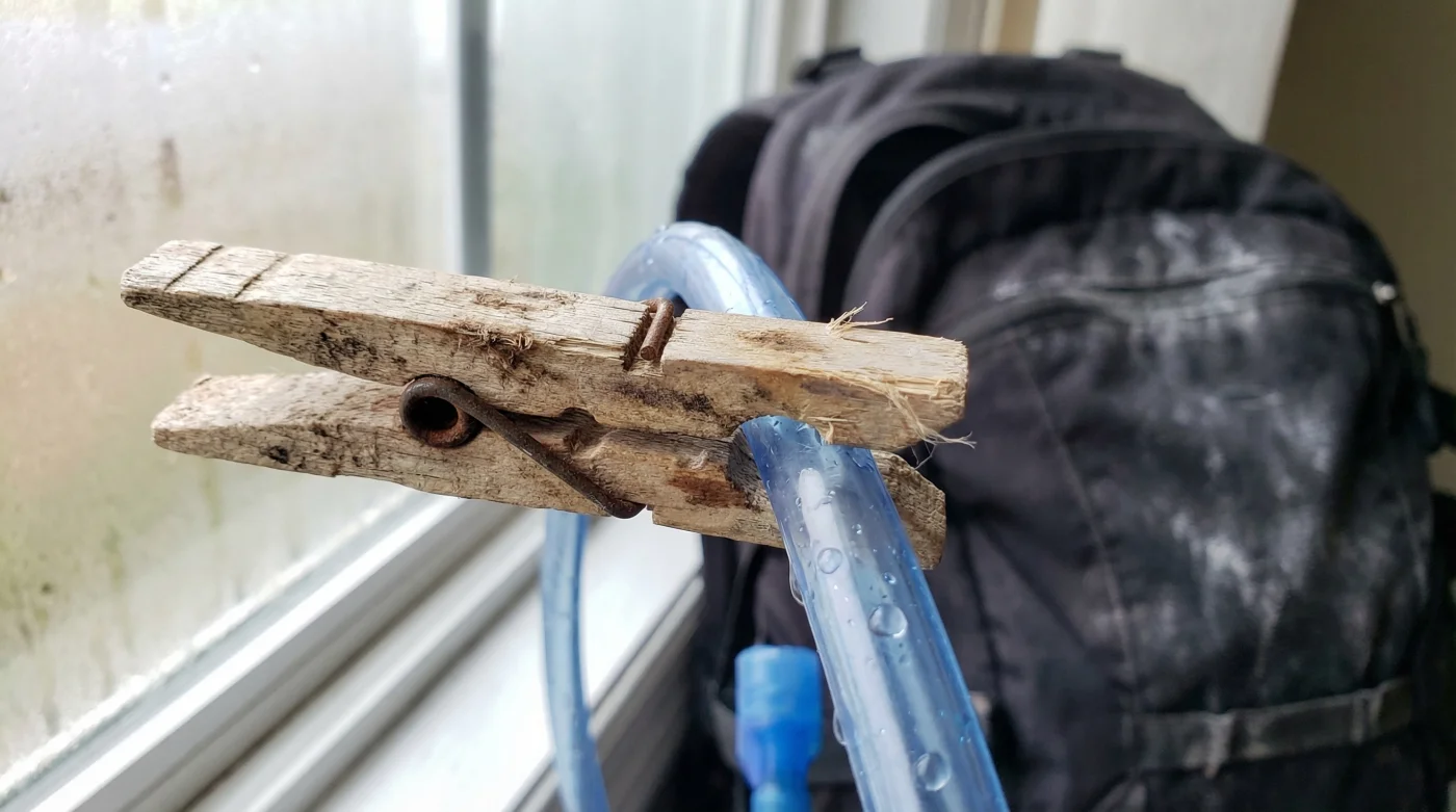 De oplossing voor je lekkende CamelBak drinkzak ligt gewoon in je eigen wasmand. Een doodgewone wasknijper stopt de lekkage namelijk direct. Door de wasknijper vlakbij de basis van de drinkslang te klemmen (waar deze uit de zak komt), blokkeer je de opwaartse waterdruk die ontstaat door de impact van je zware stappen op de trail.